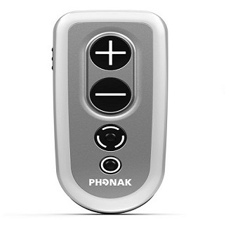 Um controle remoto discreto que tem as funções essenciais para o controle dos aparelhos auditivos pelo usuário