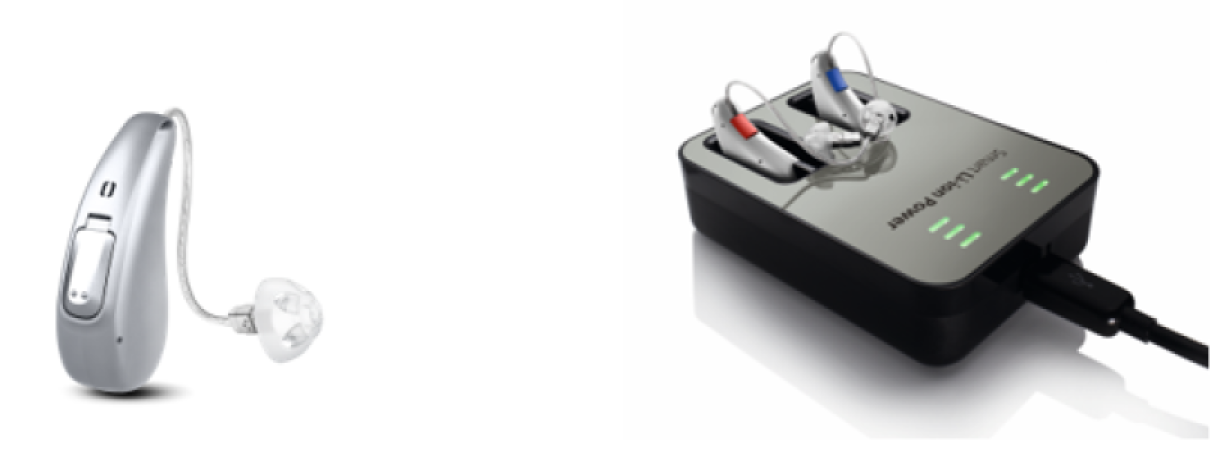 auditivo, seja com o próprio carregador, com pilhas recarregáveis, ou com pilhas